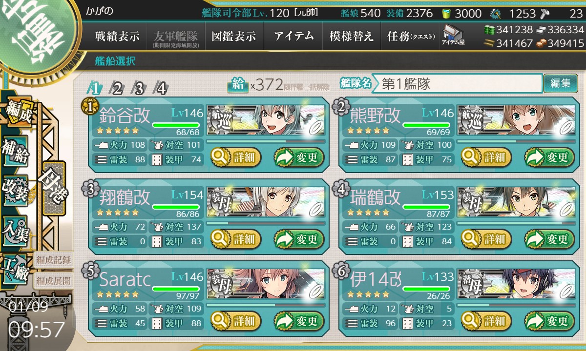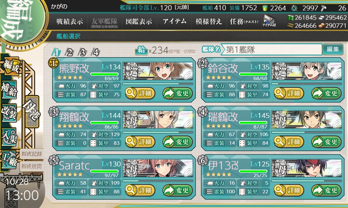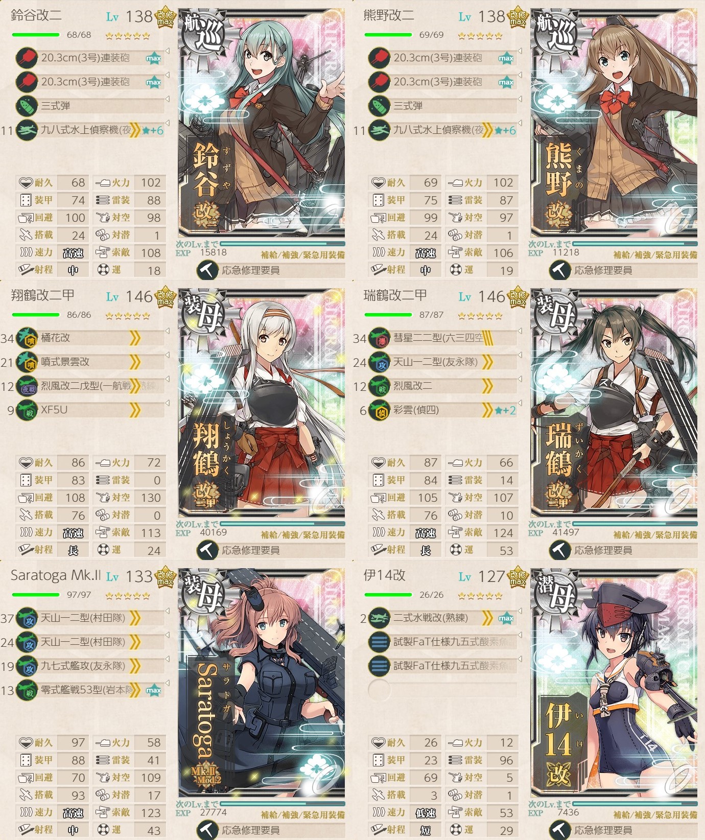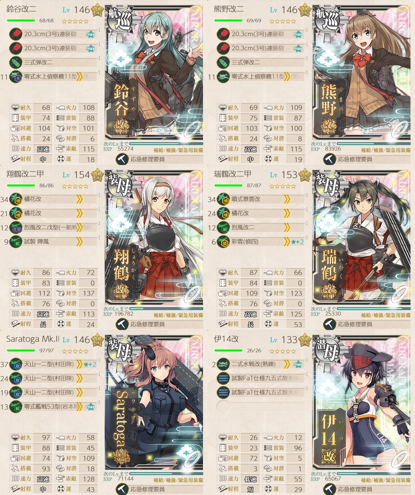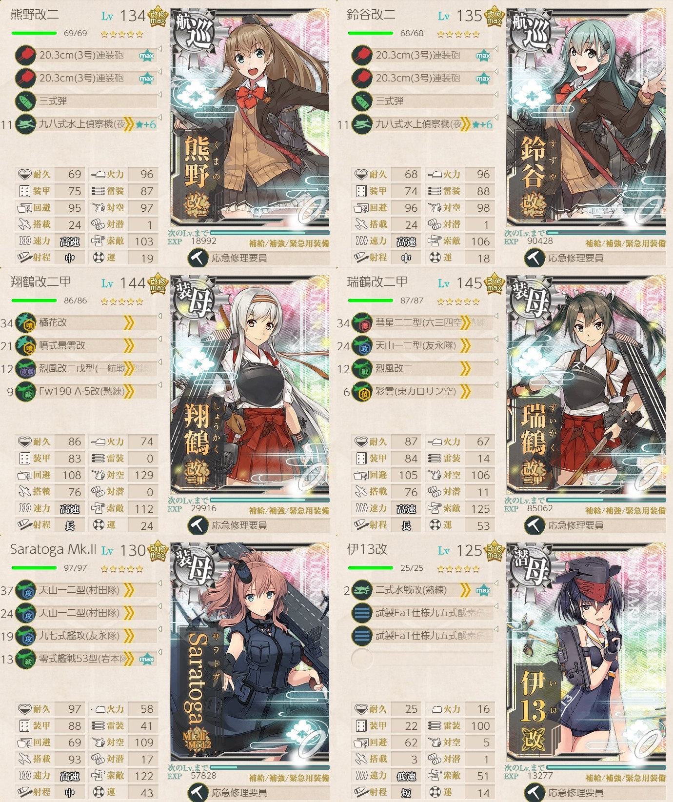 2期 3-5攻略編成 投稿日 2018年10月13日 更新日 2023年2月3日 著者 かがの カテゴリー 海域攻略 第3海域のExtra Operation「北方海域戦闘哨戒」です。 攻略ルートとしては大きく上ルートと下ルートの2つのルートがあります。 攻略Wikiへのリンク → 北方海域戦闘哨戒 最近使っている編成: 上ルート もがみん。 記事初出時の編成 航巡2、空3、潜1です。これで安定して上ルートを周回できます。 サラを夜戦装備にしていますが、夜戦までいくことはほとんどありません。 3-5です。 戦力的には何も問題ない。開幕の航空戦でボスが沈むこともあります。 ボスを4回撃破するとゲージ破壊です。
