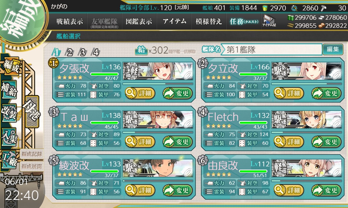 軽巡は3人まで入れられますが、軽2+駆逐4がいいっぽい。