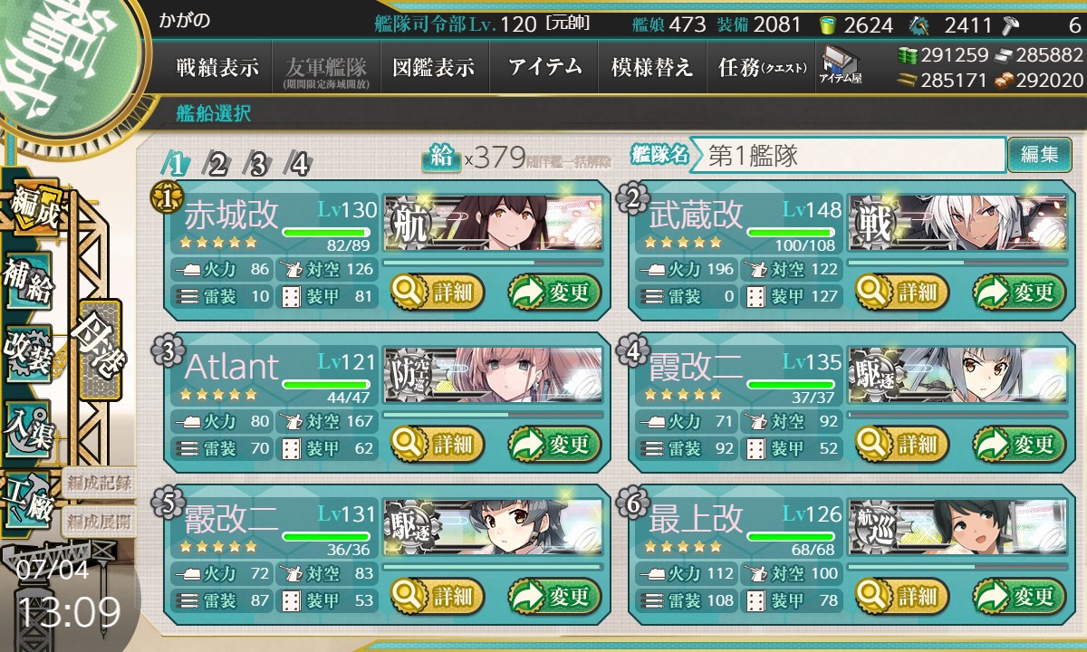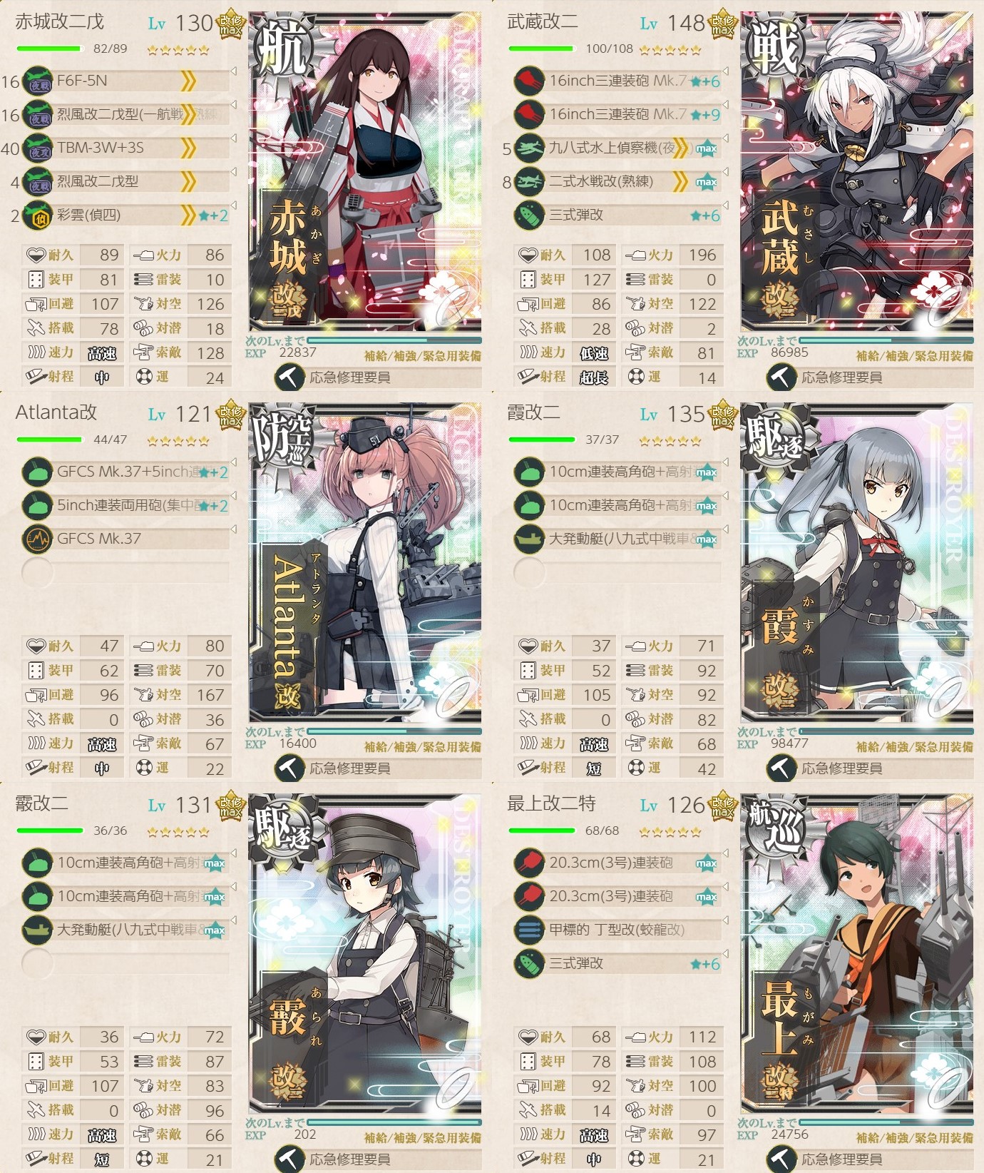 途中で潜水艦が混ざる可能性のあるマスを通るので駆逐艦には対潜装備をのせています。